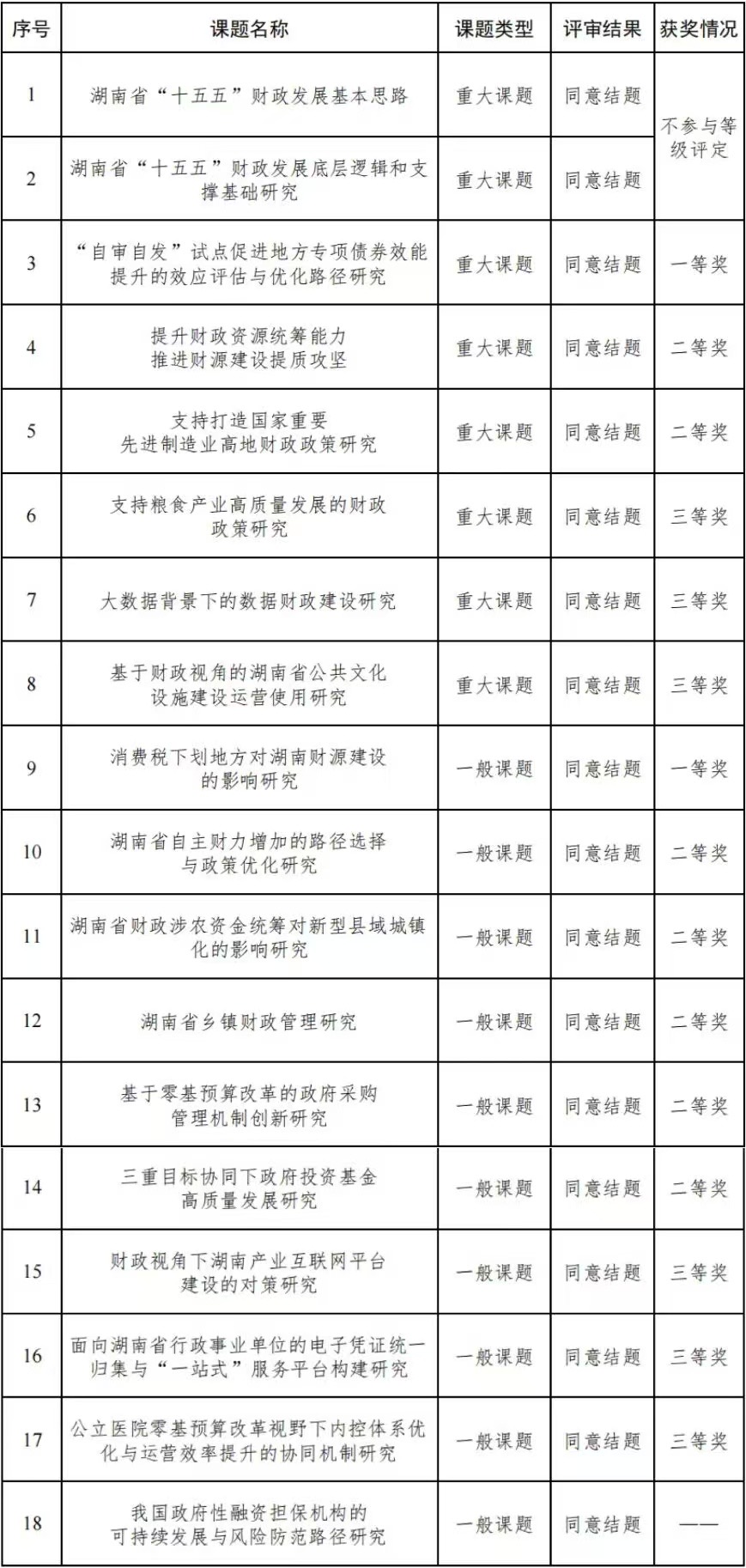湖南财政与经济发展研究中心(以下简称中心)是湖南省财政厅与湖南大学、湘潭大学、湖南财政经济拉斯维加斯 合作共建的全省财政科研基地。2025年,中心公开立项课题18项,其中,重大课题8项、一般课题10项,经专家评审,均同意结题。现将评审结果公告如下: