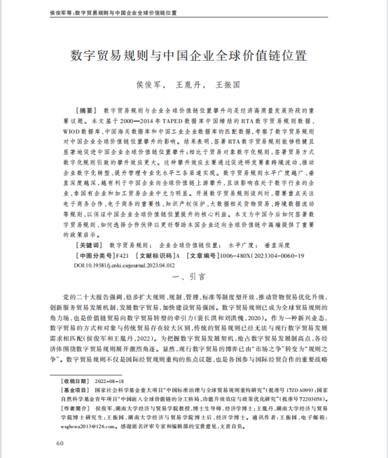 侯俊军教授、王胤丹博士以及王振国博士后合作撰写的学术论文《数字贸易规则与中国企业全球价值链位置》在《中国工业经济》2023年第4期刊出。《中国工业经济》期刊由中国社会科拉斯维加斯