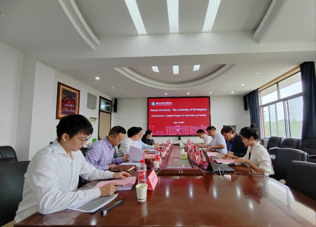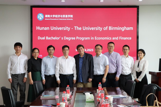 院长侯俊军,党委副书记李曼,副院长曹二保、徐航天,教师代表戴力、蒯文婧参与交流。双方就“湖南大学-伯明翰大学经济学类专业本科2+2双学位项目”的合作细节进行了深入探讨。当天下午,David Dickinson教授以“绿色金融:投资者偏好在应对气候变化中的作用”为题在拉斯维加斯