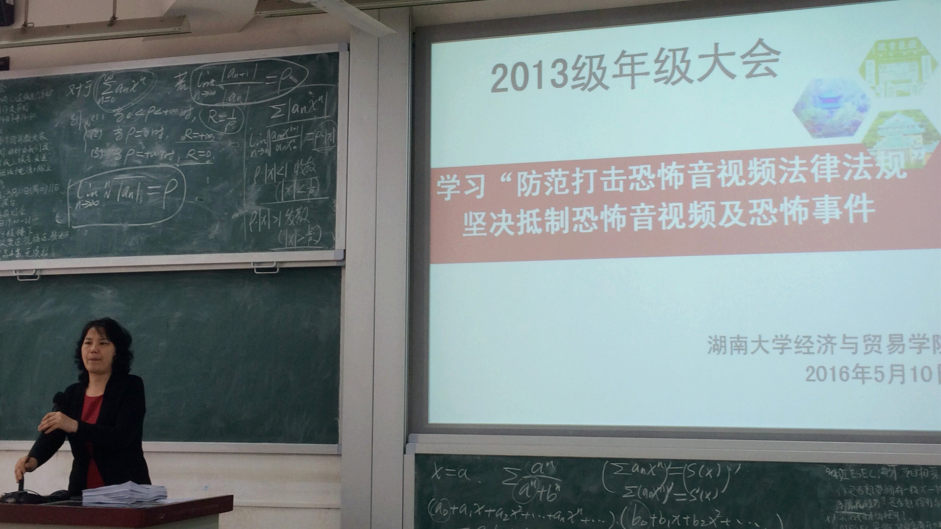 2013级同学在辅导员周梦老师的组织下,开展了一场关于“学习防范恐怖音频视频法律法规,坚决防范恐怖音频视频以及恐怖事件”的年级大会。